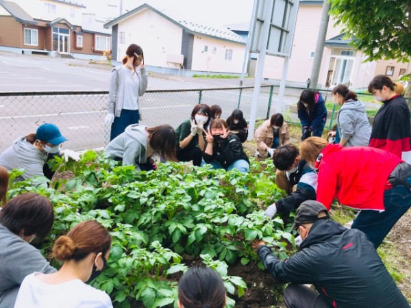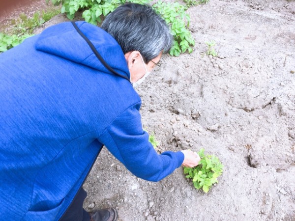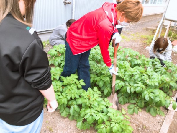 6月の授業中の一コマ。ジャガイモは茎が成長して芋ができます。学生たちは茎の部分に土を被せる作業をしました。