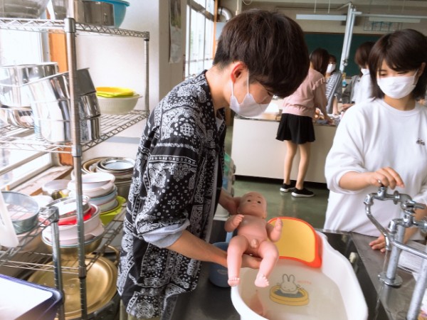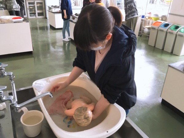 この日は沐浴の他、身体の計測や着替えの仕方なども学びました。教えてくださるのは、看護師資格を持ち、5人のお子さんを持つ長谷先生。自身の子育てエピソードの談話も、学生にとっては貴重の学びの機会となっています。