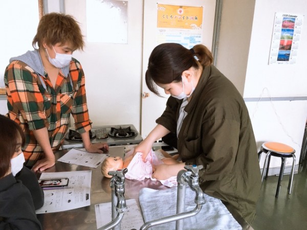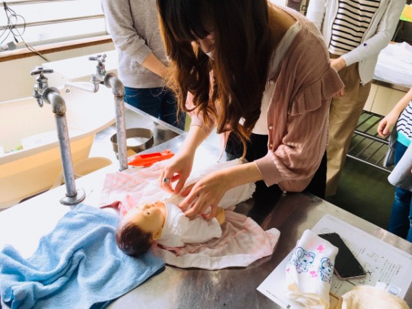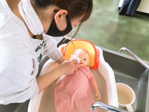 実際にお湯を貼ったベビーバスと、新生児人形を活用し、習った手順に従って作業を進めていきました。