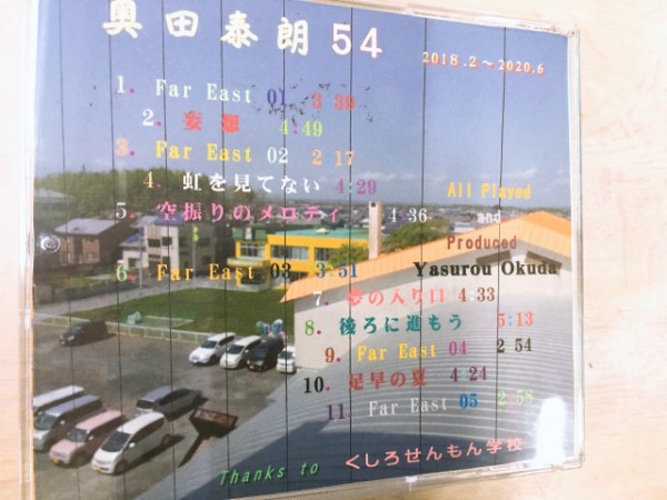 お話を聞いていくと、お父様が音楽教師という幼少期の環境が、奥田先生の背景にあり、音楽活動がスタートするわけですが、『美術』をお仕事とされ、そして『音楽』を趣味とした活動は、『芸術』という言葉で表現できるのでは、といきつきました。芸術家としての表現方法が、CD制作であり、ジャケット作成であり、溢れる才能と継続の力が今日の日まで、そして、これからも続いていくのだと感じました。
