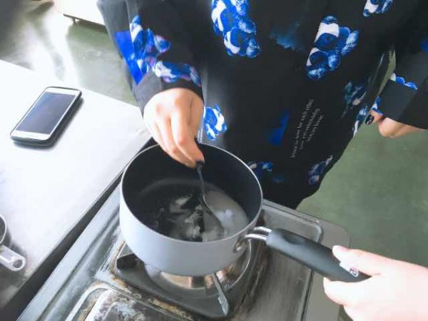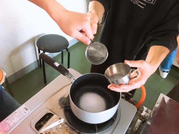 さぁ、調理室に移動して、いよいよ「べっこう飴つくり」の開始です。鍋に材料の砂糖とお水(3対1)を入れます。