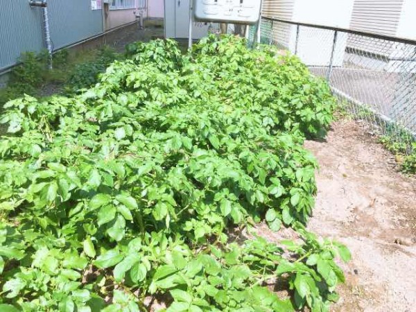 初夏、青々と茂るじゃがいもの葉。こんなに大きく育つために、盛り土をしたり、肥料をやったりと、命に寄り添うことの大切さを学んだ学生たち。