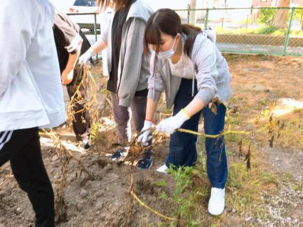 授業の担当者は、元北海道教育大学教職大学院特任教授の近藤先生。(写真奥)収穫の時間は『生活』のコマでは取れなかったので、教育実習指導の時間に行いましたが、忙しい近藤先生は駆けつけてくれたのです。大好きな近藤先生に会えて、学生はとても嬉しそうでした。軍手の差し入れもありがとうございました。