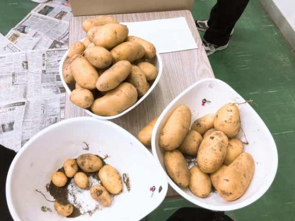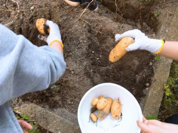 その2年生が『生活』の授業の中、学校の裏畑で育てたじゃがいも畑の収穫作業を行いました。春に植えたじゃがいもはすくすくと青葉を広げ、土の中では大自然の養分を受けながら静かに成長していたお芋たち。やがて地表の葉は枯れて、萎れていっても、土の中ではむっくり、むっくりと成長を続けていたのです。担当の近藤先生と、学生が手塩にかけ、収穫したじゃがいもは全部で何と17.6kg。1人7・8個ずつ分けて持ち帰りました。