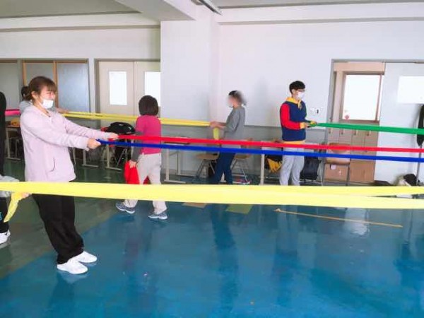 伸縮性を活用、2人1組で引っ張りっこ。どんどん伸びて、あー楽しい。