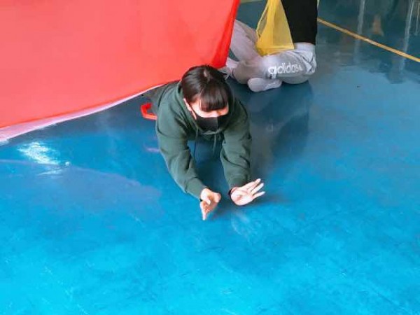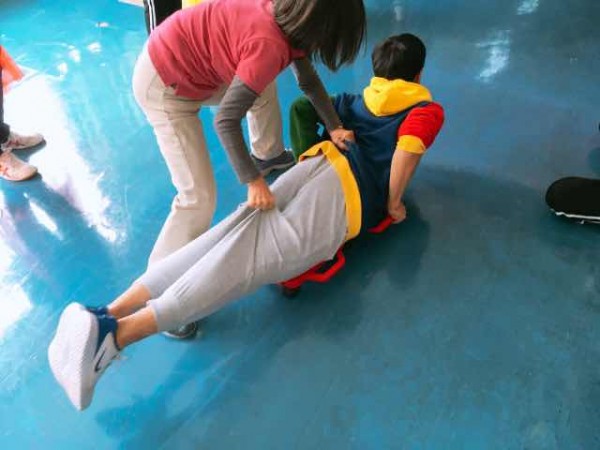 さて、次は滑車がついたスライダーボードに乗ってスカーフの橋の下を通り抜けます。美穂子先生が自ら見本を示して下さり・・ザー。アッという間に行っちゃいました。さぁ、皆さんも体感しましょう。