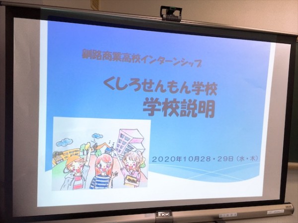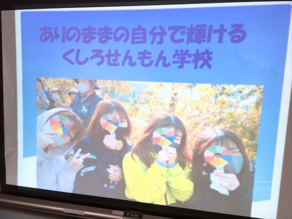 パワーポイントを活用した学校紹介では、くしろせんもん学校の魅力を紹介しました。