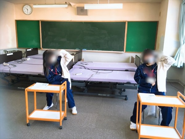 保育と介護の体験授業は、商業高校は2グループ、北陽高校は3グループに分かれて行いました。
