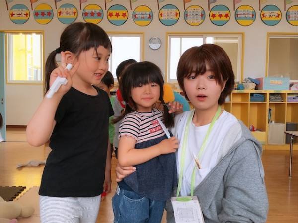 1年次。保育基礎演習の授業で、わかばフレンドようちえんの園児たちとふれあう田原さん。