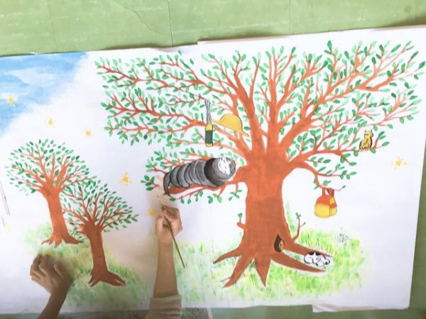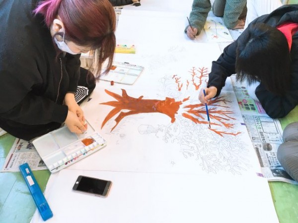 こちらはビッグ絵本。巻紙上にした模造紙に、下書きをし、絵の具で仕上げます。