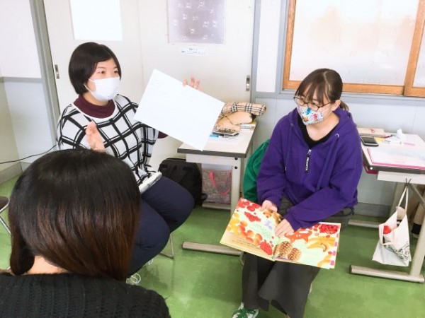 前週に、釧路市立図書館で借りて来た絵本を題材として、どんな手法で展開していくのかを話し合う学生たち。