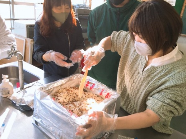 地域福祉論の授業では、お湯を注ぐだけで食べられる、炊き出し用の非常食米『アルファ米』五目ご飯を試食しました。備蓄、調理、配食までをこのダンボール一つで行える炊き出しセットでした。