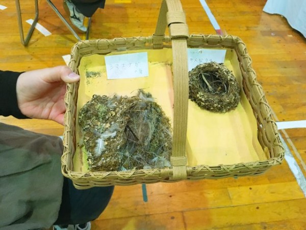 左がシマエガナの巣です。苔や枯葉、発泡スチロール、羽毛、蛾、蜘蛛の巣、あらゆるものを活用し、生まれて来る雛のために懸命に作ります。