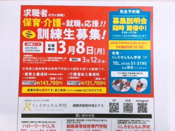 この時期のみのご案内となる、保育士養成科と介護福祉士養成科の募集説明会です。