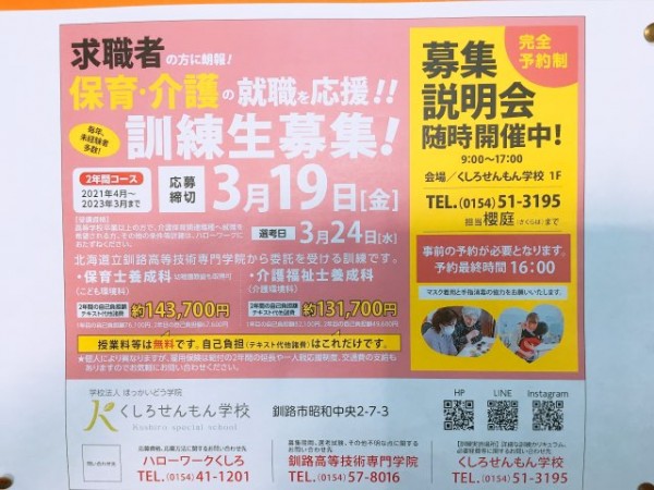 ☎️電話予約 0154513195 くしろせんもん学校 櫻庭(さくらば)