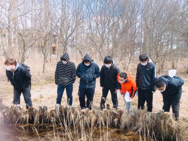 森の奥には池もあり、魚がいないかと覗きみる学生たち(#^.^#)