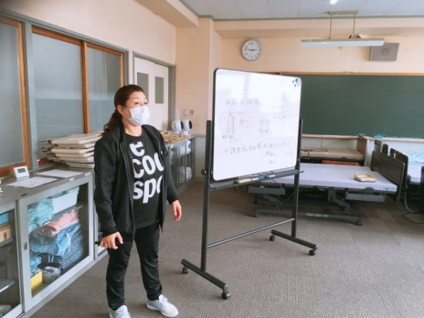 今日紹介するニュースは、車いすの屋外における移動介助の方法です。担当は介護環境科専任講師の伊東利恵先生です。実践の前に、要点を丁寧に解説してくださる伊東先生。