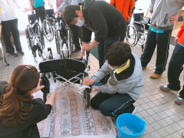 屋外で使用した車いすの汚れを、丁寧に拭き取りました。