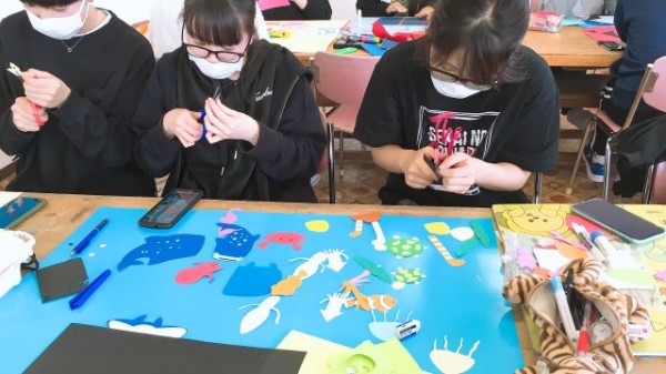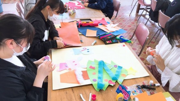 この日の授業では、グループに分かれて四季の園行事を調べ、それぞれのグループが工夫を凝らしながら壁面装飾を作成しました。