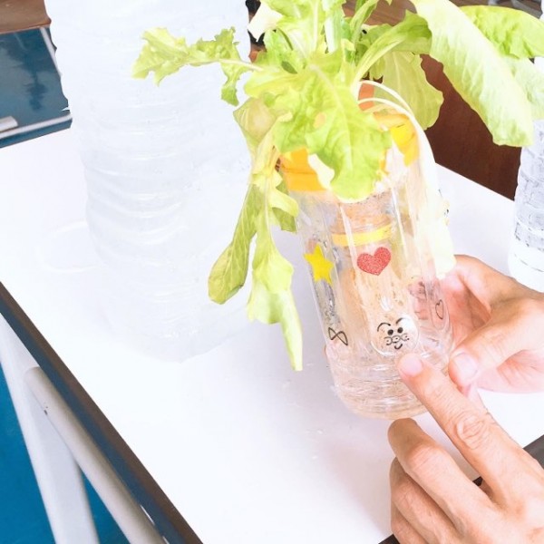 ペットボトルを活用してリーフレタスを栽培しています。これは近藤先生が作った肥料水。芽が出て、落ち着いて来たレタスは、この肥料水で育てます。