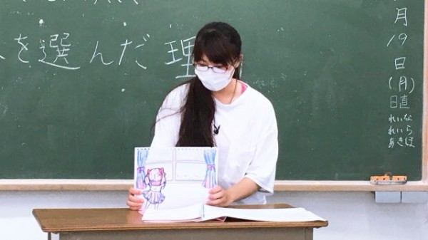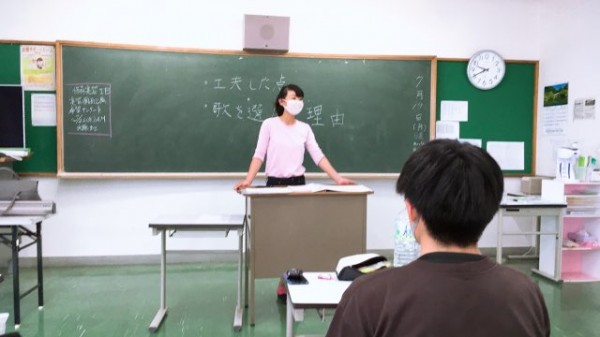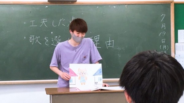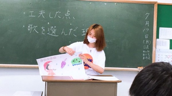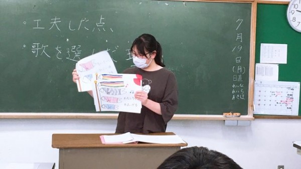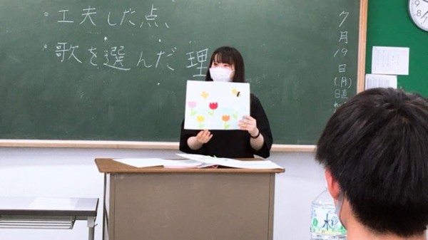 この日の授業では、園で大人気の童謡を題材にした絵本をヒントに、学生自身が好きな童謡を紙芝居仕立てに表現したもの発表し合いました。
