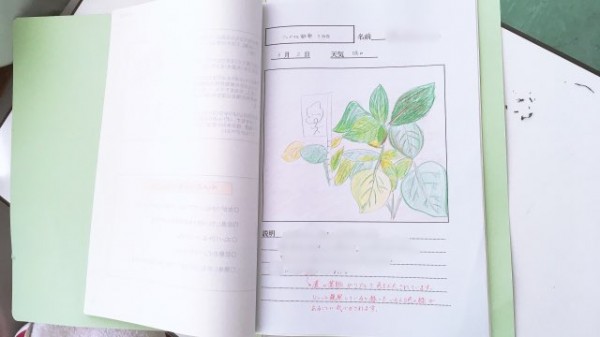 栽培絵日記も楽しかった思い出です。小学生の頃を思い出し、懐かしさとともにペンを走らせました。(絵日記撮影とコメントをくれた優しい学生さんに感謝!です)