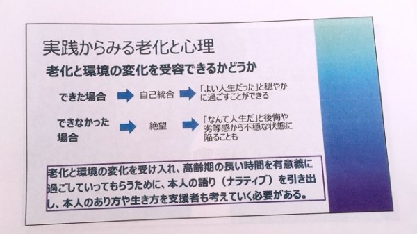 発達段階と発達課題についての講義の中で、実践からみる老化と心理について学びました。