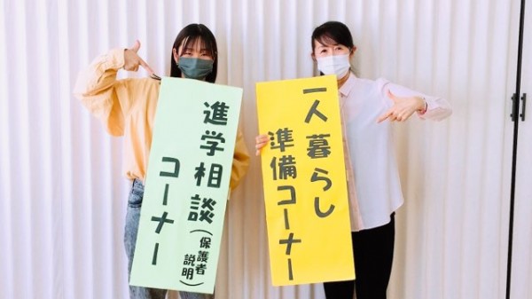 1階会議室では進学相談コーナーを開催しています。一人暮らし応援パンフレットも準備しています。また、保護者の皆さまへの個別説明も承っております。お気軽にお立ち寄りください。
