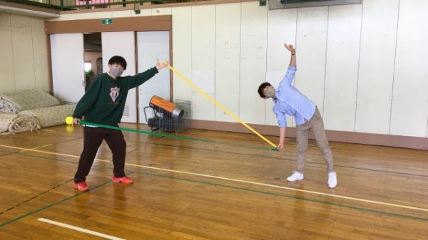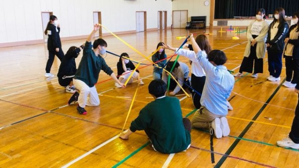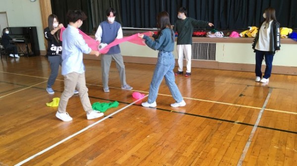 スカーフは、布の持つ特性を活かしさまざまな遊びを展開できます。本来であれば、保育所に出向き、幼児の発達アセスメントを行ったり、ムーブメントプログラムを実践します。しかし、今年は緊急事態宣言発令中を考慮し、校外学習を行わず、校内において学生同士で実践しました。