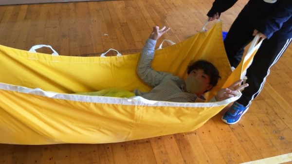 丈夫な布に持ち手をつけたユランコ。縦運動、横運動、回転を実際に体験して、その楽しさを実感しました。