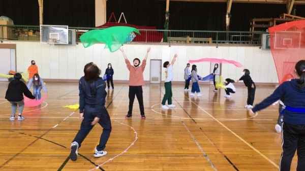 ムーブメント教材のスカーフを用いて遊びを展開する学生たち。カラフルで柔らかく伸縮性に富むスカーフを活用して、さまざまな遊びを立案していきました。