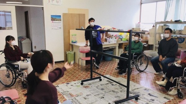 片マヒ車いすの利用者という設定の4人は、健常な方の手を用いて、どんどんお手玉を載せていきました。(学校インスタで動画配信しておりますのでご覧ください)