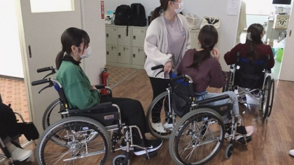 ボードゲームを終了し、次の実践へ。車いす歩行も慣れてきましたね。