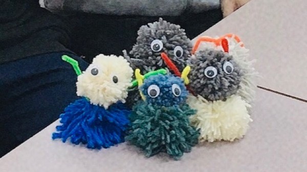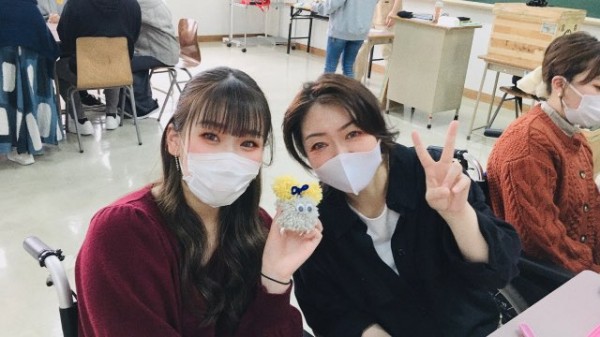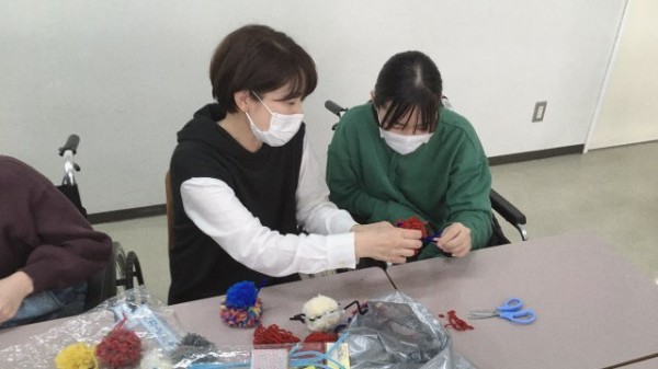 次は毛糸とモールを用いて人形を作成するアクティビティです。左手しか使えない利用者さんにどこまで援助をし、どの部分を実践し楽しんでもらうのか、また、どうケアにつなげていくのかを考えて実践しました。