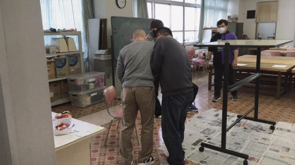 この日の授業は、2年生が立案したアクティビティ・ケアの実践計画を、1年生が利用者役となり、実践しました。利用者役となる1年生は、片マヒ車いす、認知症、高齢健常者という設定のグループに分かれ、それぞれの設定者への対応も、プランニングの内容に組み込まれる、という盛りだくさんの実践内容でした。