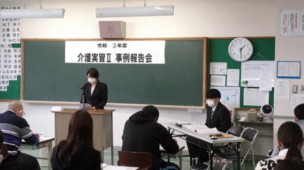 介護環境科2年生は、地域の介護施設で行った5週間の実習報告会を開催しました。介護実習IIでは、5週間行った実習の中で、特定の利用者の方との関わりを論文化したものを一冊の報告集にまとめました。この日は、その報告集をもとに、一人8分間という限られた時間の中で、1年生や実習施設職員の皆さまへ向け、報告しました。