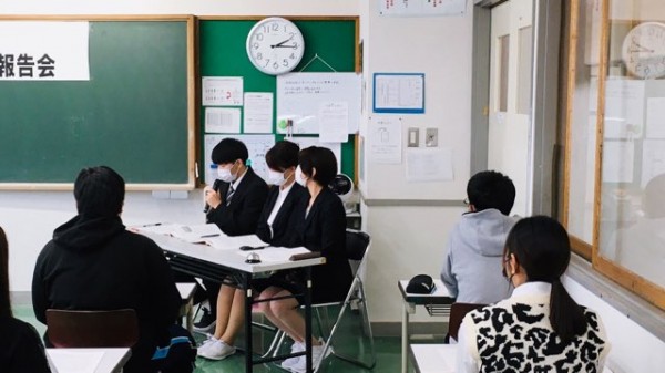 スーツ姿で報告会に臨んだ学生。緊張感漂う中、しっかりと発表していました。