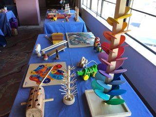 会場内に展示されたカラフルでリハビリ効果をもたらすものとして期待されているアクティビティ トイの数々。(釧路専門学校所有)
