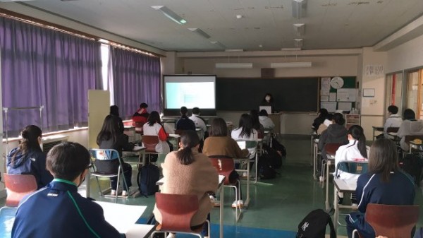 ここからは2グループに分かれて、5階建ての本校の校内見学と授業見学を行いました。1クラス5分程の見学で、先輩たちの学習環境を見学しました。