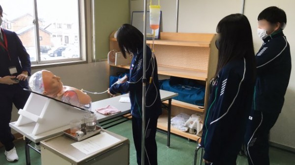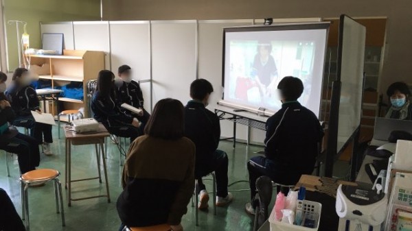 Bグループは2階の医療的ケア室で、医療的ケア体験授業に参加しました。前半は、特別支援学校の医療的ケア児の動画視聴を行いました。