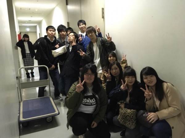 楽屋入り口でポーズを取る学生。「緊張するけど頑張ろう!」