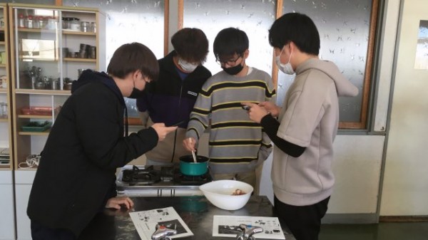 輪ゴムで縛り、ところどころ汁につけると、こんな素敵な染めものが完成しました。この後、素材を変えたり、染料を用いてさまざまな『染め』を体験しました。年明けの授業では、この染めものを素材として活用し、作品づくりに取り組む予定です。何ができるのか、楽しみにしていてください!