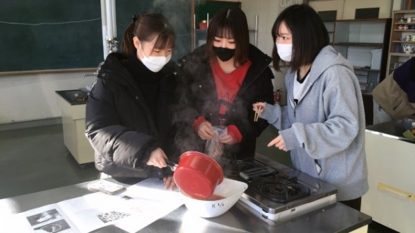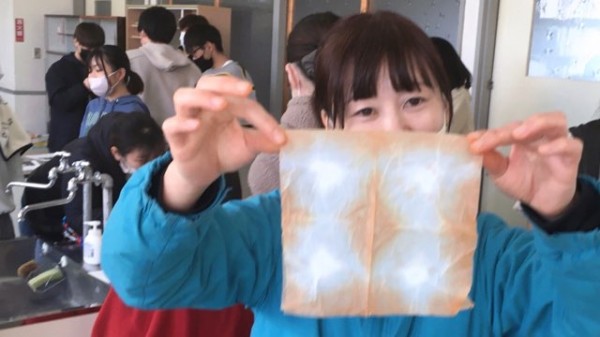 学生は玉ねぎの皮を利用した染めものに挑戦しました。