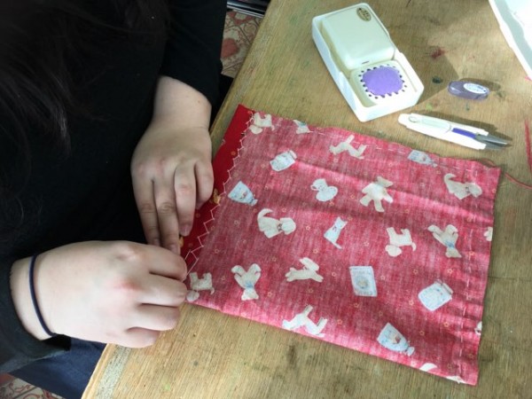 真剣な表情で巾着袋作りに取り組む学生たち。