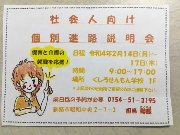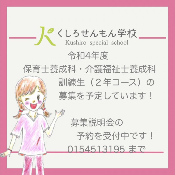 北海道立釧路高等技術専門学院から委託を受け、離職者などの求職者に向けた2年間コースの訓練生(保育士養成科・介護福祉士養成科)の募集を予定しています。