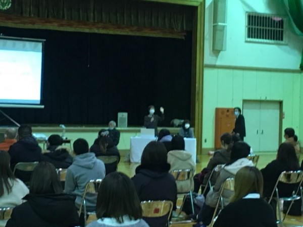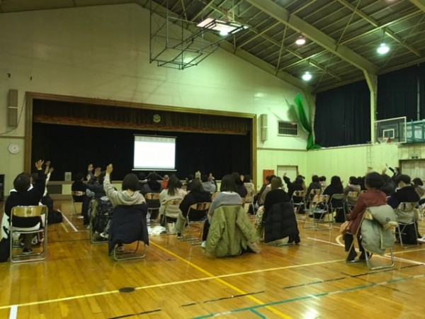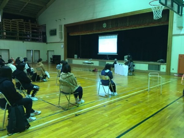 この日の特別講義は、感染対策のため、広い体育館で開催しました。釧路アイヌ語の会 事務局長の奥田幸子氏を講師に迎え、今を生きるアイヌの世界観について聴講しました。