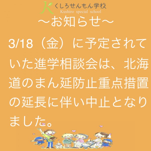 北海道私立専修学校各種学校連合会から、3月18日(金)に予定されておりました専門学校等進路相談会の開催中止のお知らせがきました。