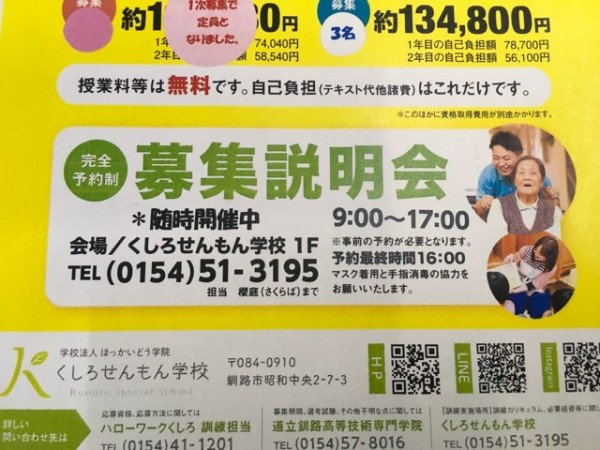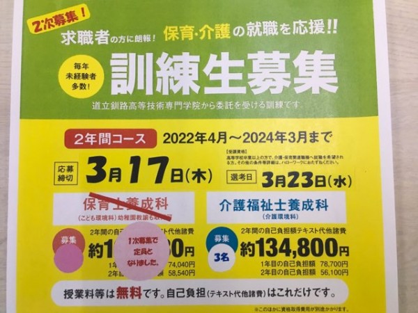 国・道から補助を受けて、社会人学生として学べる介護福祉士養成科で、3名の募集を開始します。こちらのコースは、北海道立釧路高等技術専門学院からの委託を受け、離転職などの求職者に向けた訓練コースです。