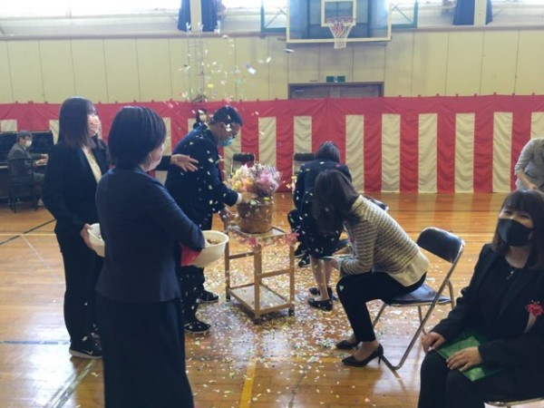 「先輩ありがとう!」と後輩から、一人ひとりに花束の贈呈がありました。
