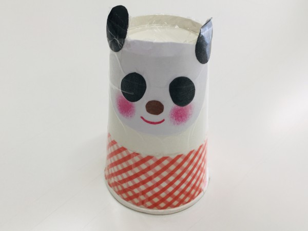 ④紙コップの下の位置に、柄折紙で胴体の部分を巻きながら貼っていくと完成です。